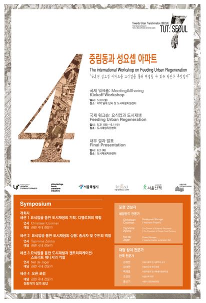 이번 워크숍에는 네덜란드의 버려진 창고를 푸드코트로 개발해 재생의 성공사례로 꼽히는 페닉스 푸드 팩토리(Fenix Food Factory) 기획에 참여한 크리스티앙 쿠이만(Christiaan Cooiman), 슈머 자일스트라(Tsjomme Zijlstra)와 도시재생 활동가인 넬 데 야거(Nel de Jager) 등 네덜란드 전문가와 국내 전문가 등이 참여한다.
