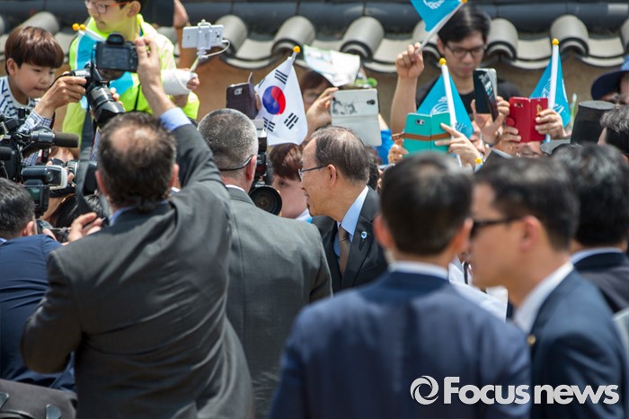 (안동=포커스뉴스) 반기문 UN 사무총장이 29일 오후 경북 안동시 하회마을 방문해 환영인파와 인사를 나누고 있다.
