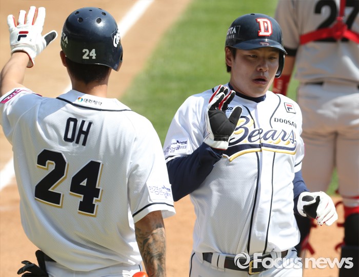 (서울=포커스뉴스) 29일 서울 잠실구장에서 열린 2016프로야구 LG-두산 경기 1회말 2사 만루에서 두산 허경민의 우전 안타떄 3루주자 오재원에 이어 2루주자 민병헌이 홈인하고 있다.
