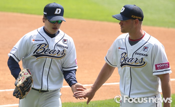 (서울=포커스뉴스) 29일 서울 잠실구장에서 열린 2016프로야구 LG-두산 경기 에서 두산 투수 보우덴이 1회초 수비를 마치고 들어오는 중견수 민병헌을 맞이하고 있다.