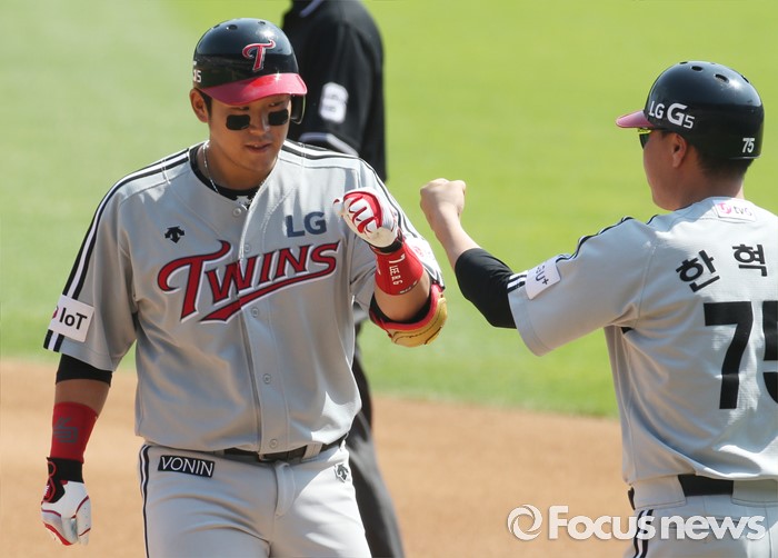 (서울=포커스뉴스) 29일 서울 잠실구장에서 열린 2016프로야구 LG-두산 경기 2회초 무사 2,3루에서 LG 유강남이 2타점 좌전 안타를 치고 1루에서 한혁수 코치의 축하를 받고 있다.
