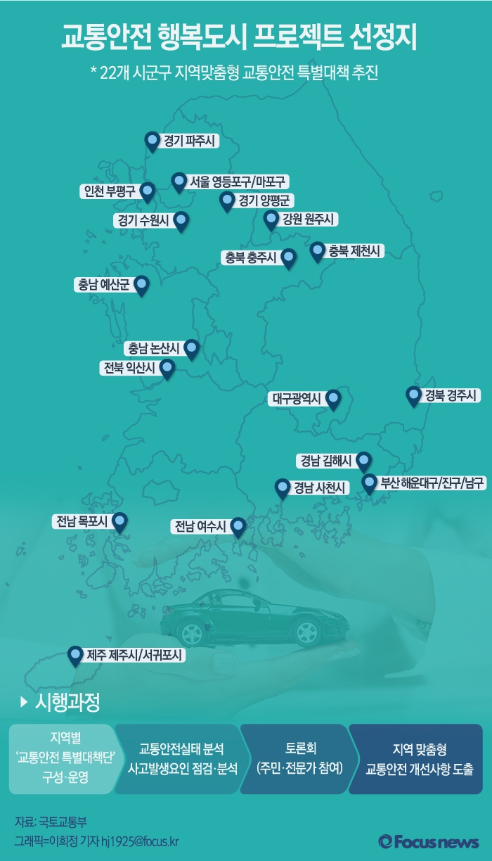 (서울=포커스뉴스) 국토교통부는 교통사고로 인한 사망자를 대폭 감소시키기 위해 전국에 새로운 교통문화 확산의 거점 역할을 할 22개 시군구를 선정, 지역맞춤형 교통안전 특별대책을 추진한다고 29일 밝혔다.