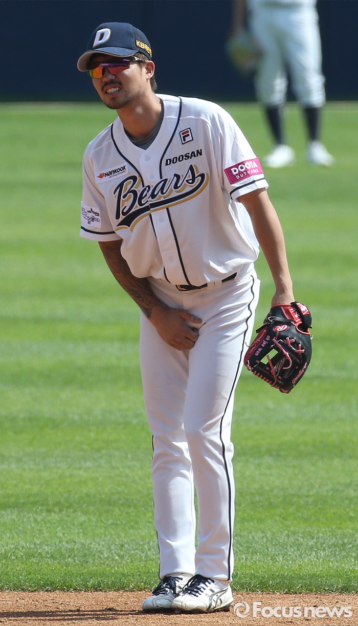 (서울=포커스뉴스) 29일 서울 잠실구장에서 열린 2016프로야구 LG-두산 경기 3회초 1사후 LG 박용택의 타구를 잡다 급소를 맞은 두산 2루수 오재원이 통증을 참고 있다.
