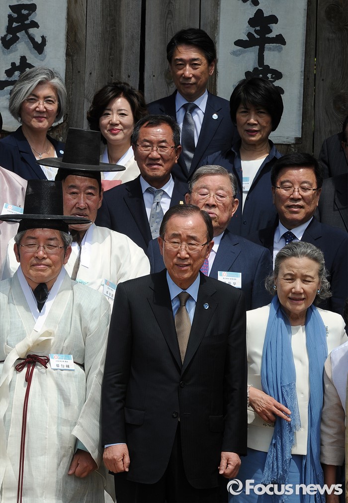 (안동=포커스뉴스) 반기문 유엔 사무총장이 29일 오후 유네스코 세계문화유산으로 등재된 경북 안동 하회마을을 방문해 충효당 앞에서 기념 촬영을 하고 있다.