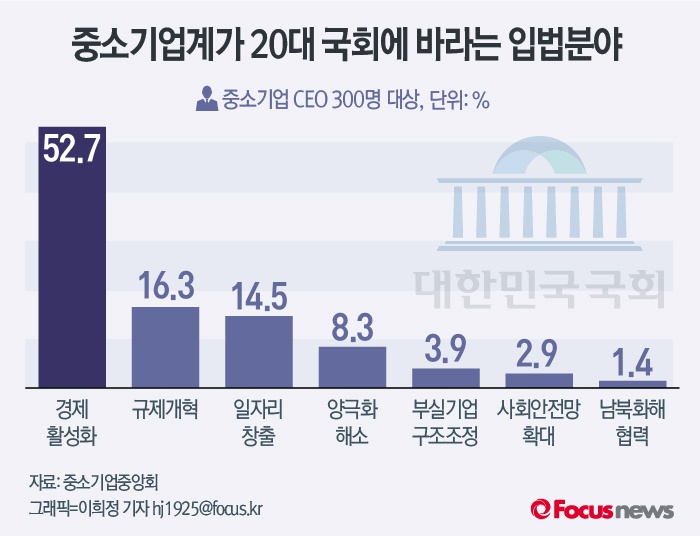 (서울=포커스뉴스) 29일 중소기업중앙회가 중소기업 CEO 300명을 대상으로 실시한 '20대 국회에 바란다' 의견조사 결과에 따르면 중소기업 CEO들은 20대 국회가 가장 우선 처리해야 할 입법분야로 경제활성화(52.7%)를 꼽았다. 또 규제개혁(16.3%)과 일자리창출(14.5%)이 뒤를 이었다.