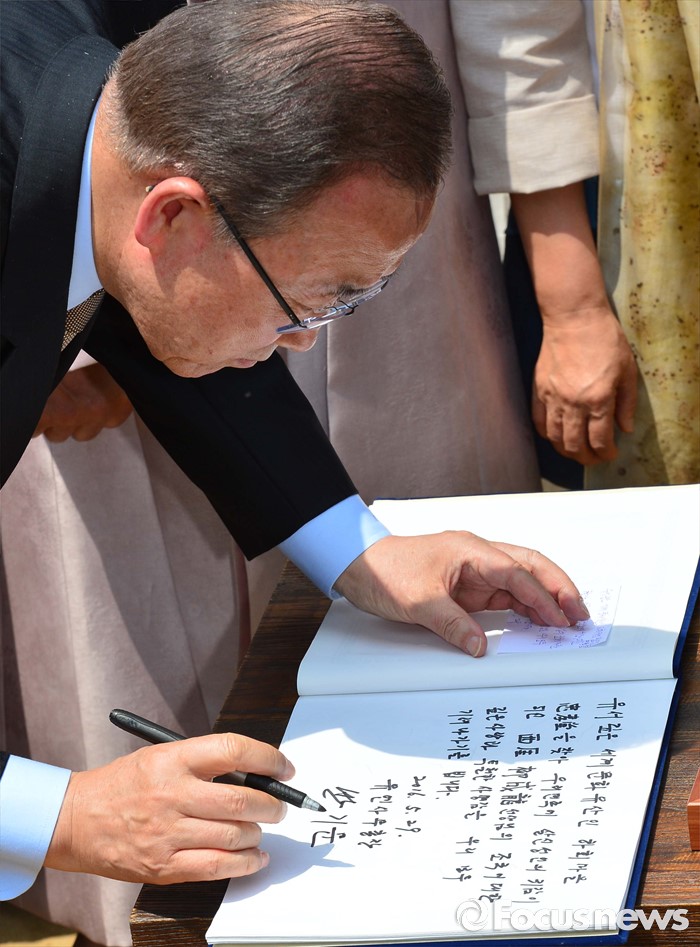 | △ 방명록 작성하는 반기문 유엔 사무총장 |