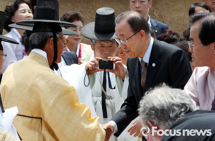 (안동=포커스뉴스) 반기문 유엔 사무총장이 29일 오후 경북 안동 하회마을 충효당을 방문해 시민들과 인사하고 있다.
