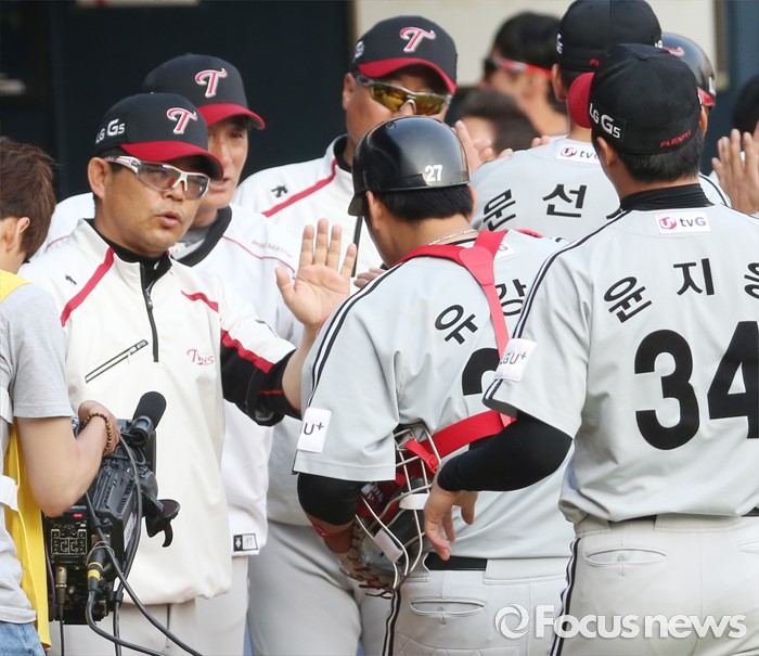 (서울=포커스뉴스) 29일 서울 잠실구장에서 열린 2016프로야구 LG-두산 경기에서 두산을 물리치고 4연패에서 탈출하며 승률 5할에 복귀한 LG 양상문 감독이 오늘의 히어로 유강남을 맞이하고 있다.