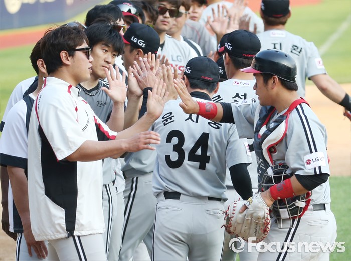 (서울=포커스뉴스) 29일 서울 잠실구장에서 열린 2016프로야구 LG-두산 경기에서 두산을 물리치고 4연패에서 탈출하며 승률 5할에 복귀한 LG 류제국과 유강남이 하이파이브하고 있다..