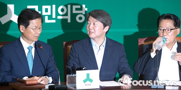 (서울=포커스뉴스) 20대 국회 임기가 시작된 30일 오전 서울 여의도 국회에서 열린 국민의당 최고위원회의에 참석한 안철수(가운데) 상임공동대표와 천정배(왼쪽) 공동대표가 대화하고 있다. 오른쪽은 박지원 원내대표.
