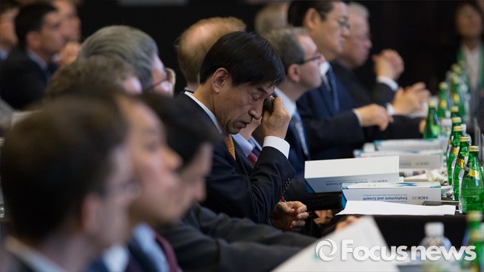 (서울=포커스뉴스) 30일 오전 서울 중구 웨스틴조선호텔에서 열린 2016 한국은행 국제컨퍼런스에서 이주열 한국은행 총재가 개회사를 마치고 자리로 돌아와 땀을 닦고 있다.