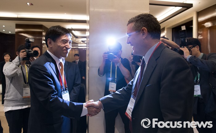 (서울=포커스뉴스) 30일 오전 서울 중구 웨스틴조선호텔에서 열린 2016 한국은행 국제컨퍼런스에서 이주열(왼쪽) 한국은행 총재가 제임스 불라드 세인트루이스 연은 총재와 악수를 하고 있다.
