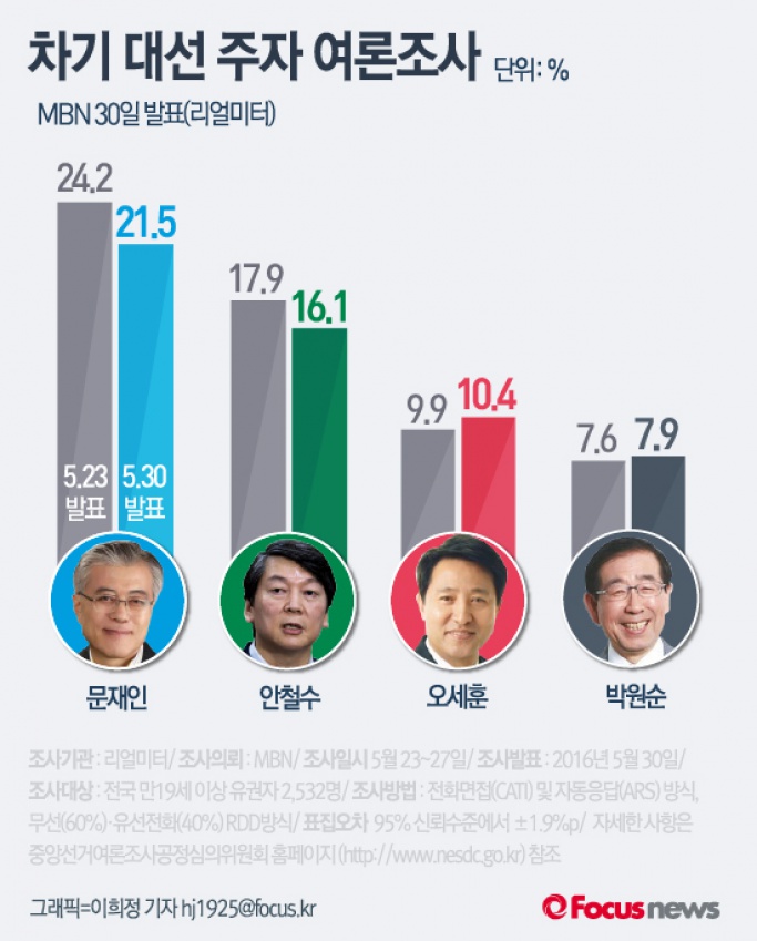 (서울=포커슨뉴스) MBN이 의뢰, 리얼미터가 조사해 30일 발표한 여론조사 결과에 따르면 문재인 전 대표의 지지도는 지난주에 비해 2.7%p 하락한 21.5%를 기록했다. 문 전 대표는 20주 연속 부동의 1위 자리를 지키고 있다.