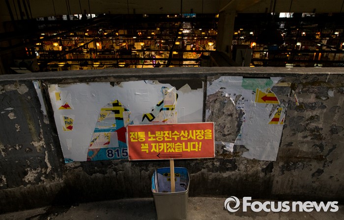 (서울=포커스뉴스) 30일 오전 서울 동작구 구 노량진수산시장에서 서울중앙지법 관계자들이 법원의 점유이전금지가처분을 집행한 가운데 시장 통로에 '전통 노량진수산시장을 꼭 지키겠습니다'라고 적힌 팻말이 놓여 있다. 법원은 이날 영업은 지속하되 수협의 동의없이 가게를 타인에게 이전·전대하면 안된다고 상인들에게 통보 했다.