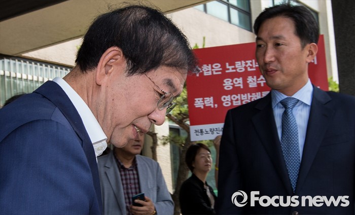 (서울=포커스뉴스) 30일 오전 서울 동작구청에서 박원순 서울시장이 노량진수산시장 상인생계대책위원회 관계자들의 손팻말 앞을 지나가고 있다.