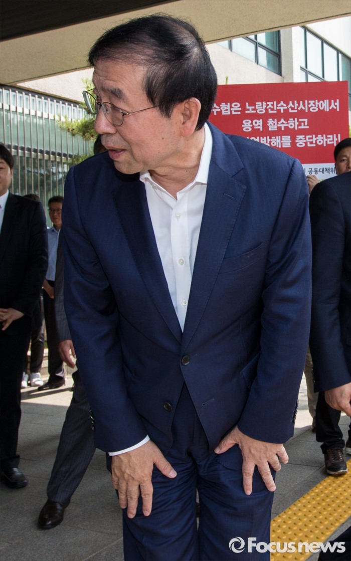 (서울=포커스뉴스) 30일 오전 서울 동작구청에서 박원순 서울시장이 노량진수산시장 상인생계대책위원회 관계자들의 손팻말 앞을 지나가고 있다.