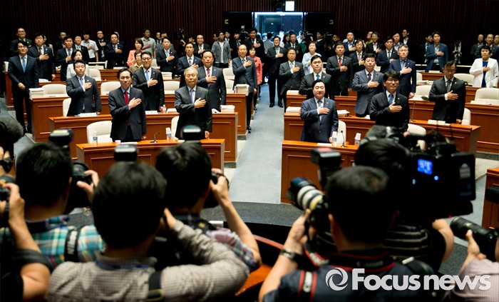 (서울=포커스뉴스) 20대 국회 임기가 시작된 30일 오전 서울 여의도 국회에서 열린 더불어민주당 의원총회에 참석한 김종인 비대위 대표와 우상호 원내대표 등 의원들이 국기에 대한 경례를 하고 있다.