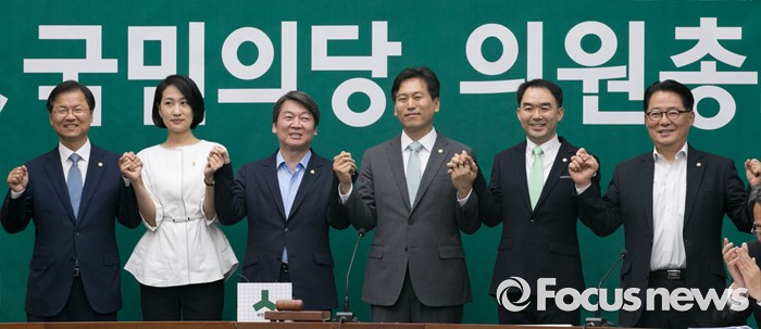 (서울=포커스뉴스) 20대 국회 임기가 시작된 30일 오전 서울 여의도 국회에서 열린 국민의당 의원총회에 참석한 안철수 상임공동대표, 천정배 공동대표, 박지원 원내대표가 초선 의원들에게 의원 뱃지를 달아준 뒤 취재진을 향해 포즈를 취하고 있다. 왼쪽부터 천정배 공동대표, 김수민 의원, 안철수 상임공동대표, 손금주, 채이배 의원, 박지원 원내대표.