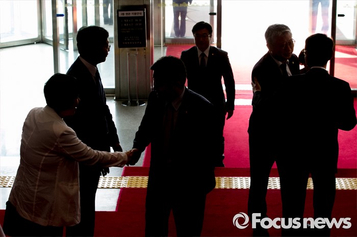 (서울=포커스뉴스) 20대 국회 임기가 시작된 30일 오전 서울 여의도 국회에서 의원들이 각 당 의원총회에 참석하기 위해 본청으로 들어서며 서로 인사하고 있다.