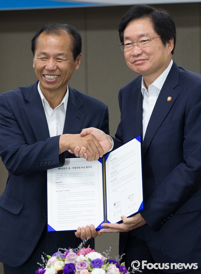 (세종=포커스뉴스) 30일 오전 세종시 정부세종청사 해양수산부 대회의실에서 열린 해양심층수 융·복합 산업 육성을 위한 해양수산부와 강원도 간 업무협약 체결식에서 김영석(오른쪽) 해양수산부 장관과 최문순 강원지사가 협약서를 들고 기념촬영 하고 있다.