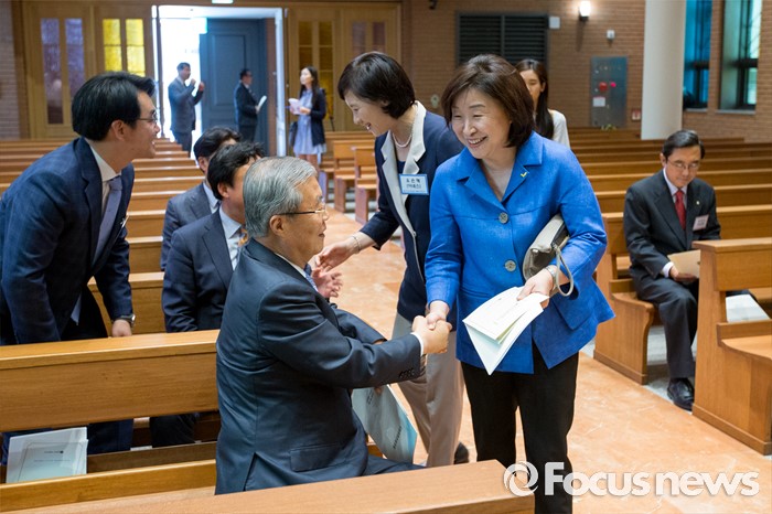 (서울=포커스뉴스) 김종인 더불어민주당 비상대책위 대표와 심상정 정의당 상임대표가 30일 오전 서울 중구 명동성당에서 열린 '국회의원 카톨릭 교우회 감사 미사'에 참석해 악수 하고 있다.