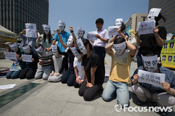(서울=포커스뉴스) 30일 오후 서울 종로구 광화문 광장에서 환경보건시민센터 관계자들이 옥시 전 사장 검찰소환 조사 촉구하는 기자회견 및 퍼포먼스를 열고 있다.