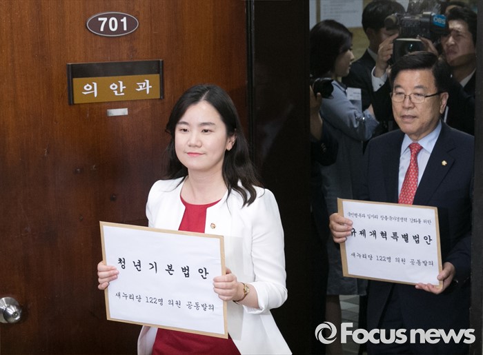 (서울=포커스뉴스) 20대 국회 임기가 시작된 30일 오후 서울 여의도 국회 의안과에서 김광림(오른쪽) 새누리당 정책위의장, 신보라 청년소통특위 부위원장 등 의원들이 당론 1호법안인 청년기본법과 규제프리존법, 서비스법 등 9개 법안 서류를 제출하고 있다.
