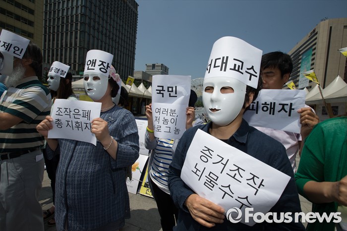 (서울=포커스뉴스) 30일 오후 서울 종로구 광화문 광장에서 환경보건시민센터 관계자들이 옥시 전 사장 검찰소환 조사 촉구하는 기자회견 및 퍼포먼스를 열고 있다.