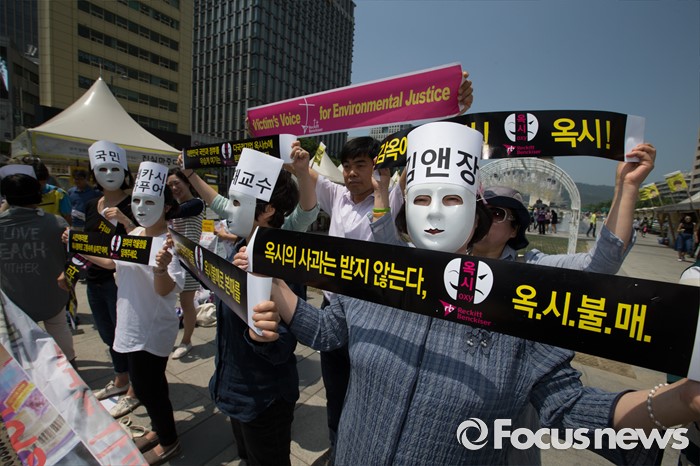 (서울=포커스뉴스) 30일 오후 서울 종로구 광화문 광장에서 환경보건시민센터 관계자들이 옥시 전 사장 검찰소환 조사 촉구하는 기자회견 및 퍼포먼스를 열고 있다.