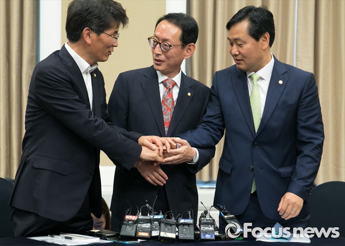 (서울=포커스뉴스) 30일 오후 서울 여의도 국회 귀빈식당에서 열린 20대 국회 원구상 협상 등을 위한 회동에 참석한 김도읍(가운데) 새누리당 원내수석부대표, 박완주(왼쪽) 더불어민주당 원내수석부대표, 김관영 국민의당 원내수석부대표가 취재진을 향해 포즈를 취하고 있다.