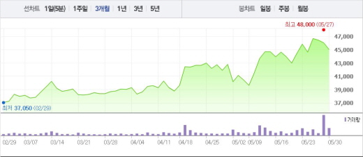 YG엔터는 30일 전일 대비 2.17%(1000원) 하락한 4만5050원에 거래를 마쳤다. 주가는 장초반인 9시20분, 소폭 상승한 4만6750원을 기록했지만 10시20분 4만5000원까지 급격하게 떨어졌다. 이후 쭉 4만5000원대를 유지하다 결국 4만5050원에 장을 마감했다.