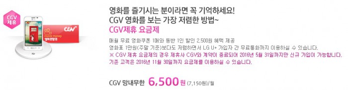 LG유플러스도 최근 CGV제휴 요금제의 신규가입을 중단한다고 공지했다. 현재 해당 요금제 사용자도 11월30일 전에 다른 요금제로 옮겨야 한다. LG유플러스는 홈페이지를 통해 “제휴사 CGV와 계약이 종료돼 31일까지만 신규 가입이 가능하다”며 “기존 고객은 11월30일까지 요금제를 이용할 수 있다”고 밝혔다. CGV제휴 요금제 역시 매월 무료 영화쿠폰 1매와 동반 1인 할인 2500원 혜택을 제공했었다.