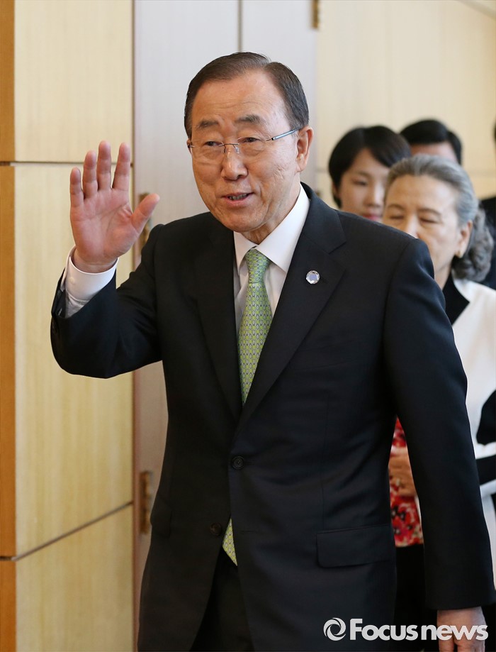 (인천공항=포커스뉴스) 방한일정을 마친 반기문 유엔 사무총장이 30일 오후 인천국제공항에서 출국에 앞서 취재진에 손을 들어 인사하고 있다.