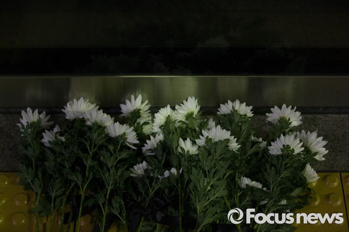 (서울=포커스뉴스) 30일 오후 서울 광진구 구의역 내 스크린도어 사망사고 발생 장소인 9-4 승강장에 국화가 놓여져 있다.