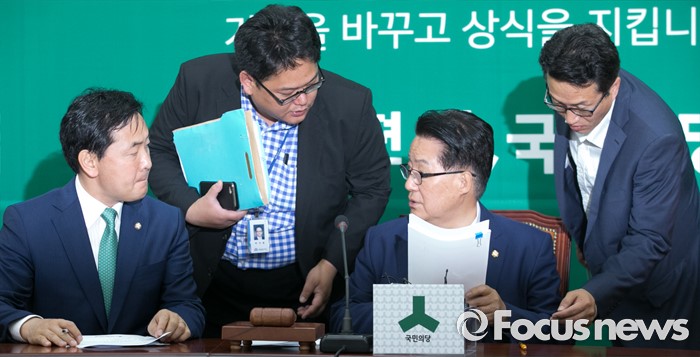 (서울=포커스뉴스) 31일 오전 서울 여의도 국회에서 열린 국민의당 원내대책회의에 참석한 박지원(오른쪽 두번째) 원내대표와 김관영(왼쪽 첫번째) 원내수석부대표와 당직자들이 대화하고 있다.
