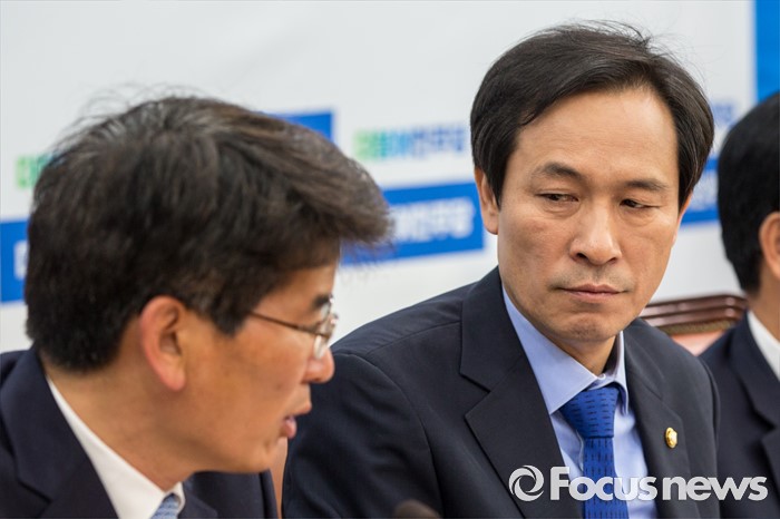 (서울=포커스뉴스) 우상호(오른쪽) 더불어민주당 원내대표와 박완주 원내수석부대표가 31일 오전 서울 여의도 국회에서 열린 원내대책회의에 참석해 대화를 나누고 있다.