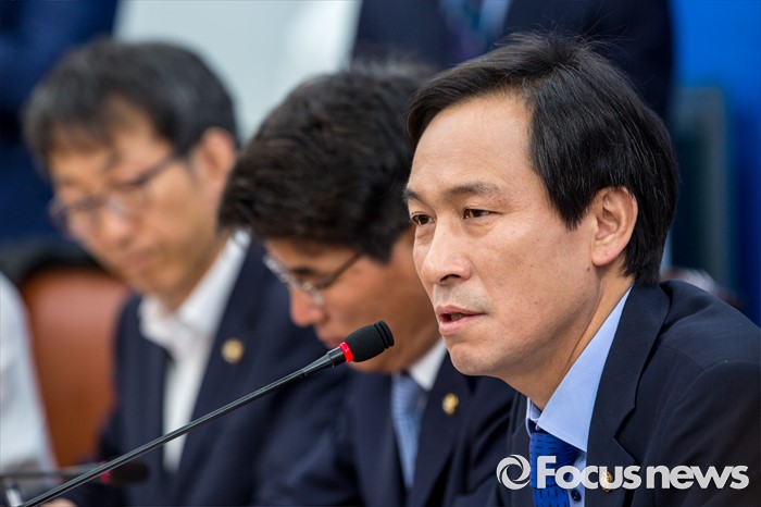 (서울=포커스뉴스) 우상호 더불어민주당 원내대표가 31일 오전 서울 여의도 국회에서 열린 원내대책회의에 참석해 모두발언 하고 있다.