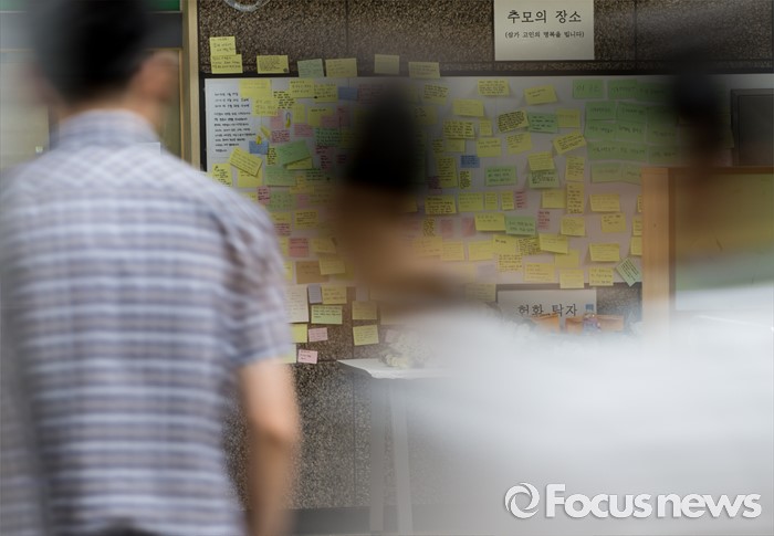(서울=포커스뉴스) 31일 오전 서울 광진구 지하철 2호선 구의역에 스크린도어 사고로 희생된 청년을 애도하는 헌시 및 쪽지들이 붙어 있다.