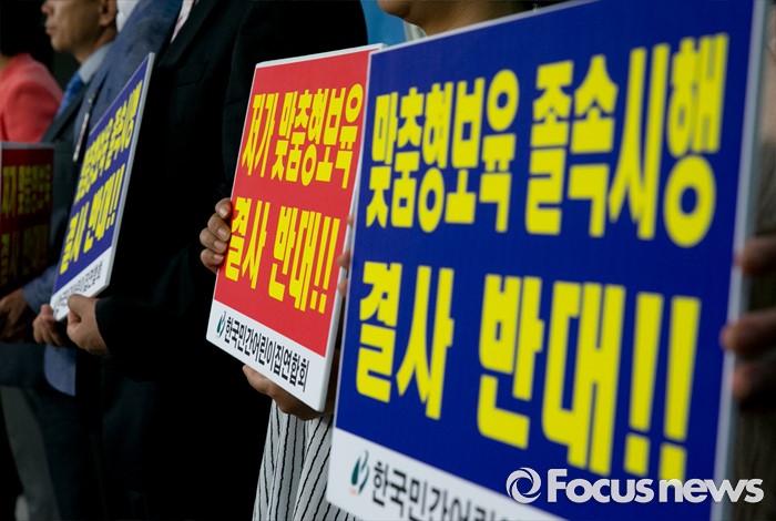 (서울=포커스뉴스) 31일 오전 서울 여의도 국회 정론관에서 한정애 더불어민주당 의원과 장진환 한국민간어린이집연합회장 등 관계자들이 어린이집 생존권 위협하는 맞춤형 보육 철회 촉구 기자회견을 하고 있다.