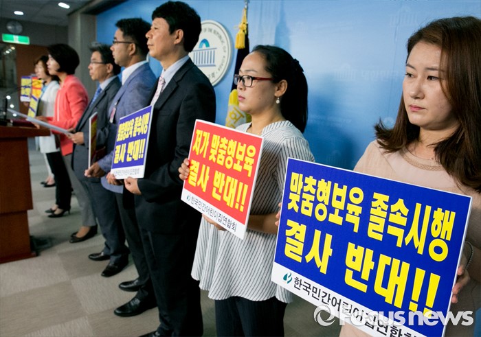 (서울=포커스뉴스) 31일 오전 서울 여의도 국회 정론관에서 한정애 더불어민주당 의원과 장진환 한국민간어린이집연합회장 등 관계자들이 어린이집 생존권 위협하는 맞춤형 보육 철회 촉구 기자회견을 하고 있다.
