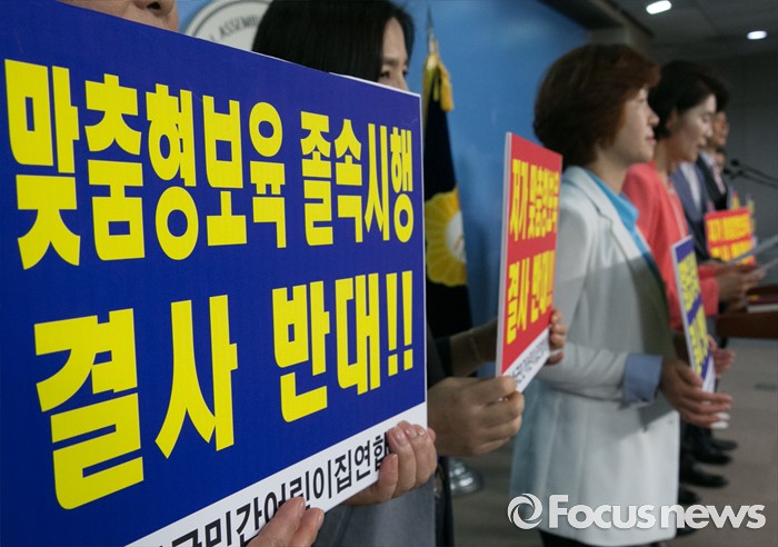 (서울=포커스뉴스) 31일 오전 서울 여의도 국회 정론관에서 한정애 더불어민주당 의원과 장진환 한국민간어린이집연합회장 등 관계자들이 어린이집 생존권 위협하는 맞춤형 보육 철회 촉구 기자회견을 하고 있다.