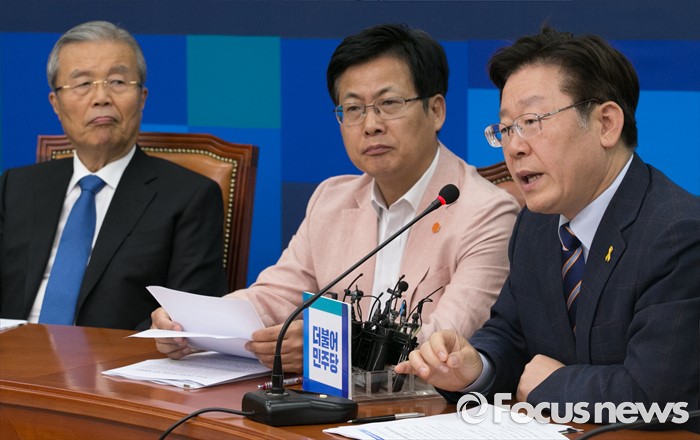 (서울=포커스뉴스) 이재명(오른쪽) 성남시장이 31일 오전 서울 여의도 국회에서 열린 지방재정 개편 관련 김종인(왼쪽) 더불어민주당 비대위 대표 등과의 면담에 참석해 발언하고 있다. 가운데는 최성 고양시장.