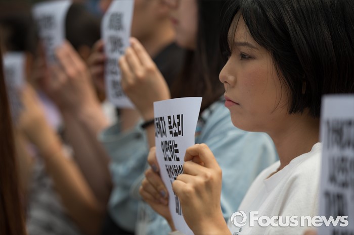 (서울=포커스뉴스) 한일 일본군위안부 합의 무효를 위한 대학생 대책위원회 학생들이 31일 오전 서울 종로구 대한민국역사박물관 앞에서 일본군위안부 피해자 의견 배제한 재단설립 강행 규탄 기자회견을 열고 있다.