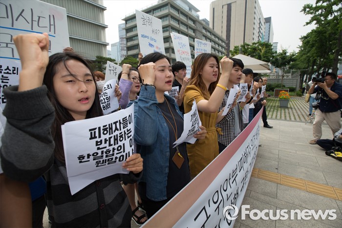 (서울=포커스뉴스) 한일 일본군위안부 합의 무효를 위한 대학생 대책위원회 학생들이 31일 오전 서울 종로구 대한민국역사박물관 앞에서 일본군위안부 피해자 의견 배제한 재단설립 강행 규탄 기자회견을 열고 있다.