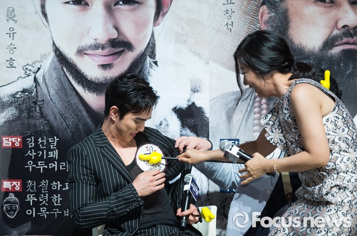 (서울=포커스뉴스) 31일 오전 서울 강남구 압구정CGV에서 열린 영화 '봉이 김선달' 제작보고회에 참석한 배우 라미란(오른쪽)이 유승호에게 사랑꾼 이라는 문구가 적힌 스티커를 전달하고 있다.