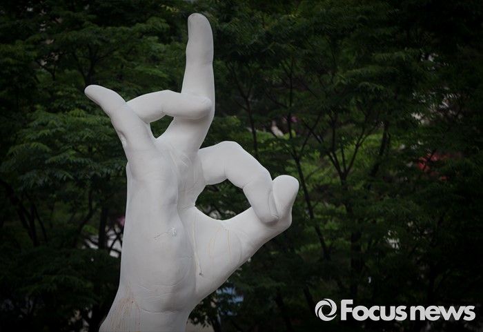 (서울=포커스뉴스) 31일 오전 서울 마포구 홍익대 정문 앞에 극우성향 사이트 '일베' 상징물 조각상이 설치되어 있다. 조각상은 일간베스트저장소를 상징하는 자음 'ㅇ'과 'ㅂ' 모양을 하며 회원을 인증하는 손 모양이다. 이 조각상은 조소과 4학년 홍기하씨가 '환경조각연구' 수업 과제로 제작되어 '환경조각연구 야외조각전에 출품한 것으로 '어디에나 있고, 아무데도 없다'는 제목을 붙였다.
