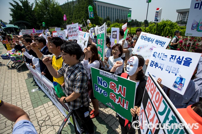 (서울=포커스뉴스) 31일 오후 서울 여의도 국회 앞에서 경제정의실천시민연합 관계자들이 옥시 제품 불매 및 옥시 예방법 제정을 촉구하는 기자회견을 하고 있다.