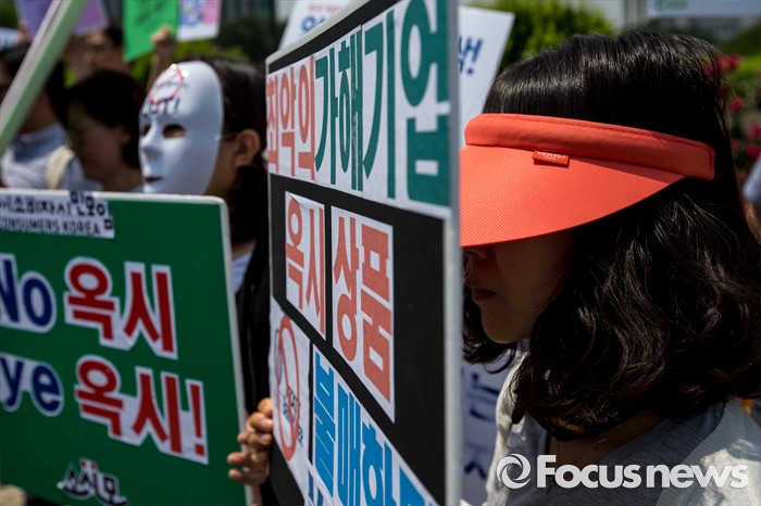 (서울=포커스뉴스) 31일 오후 서울 여의도 국회 앞에서 경제정의실천시민연합 관계자들이 옥시 제품 불매 및 옥시 예방법 제정을 촉구하는 기자회견을 하고 있다.