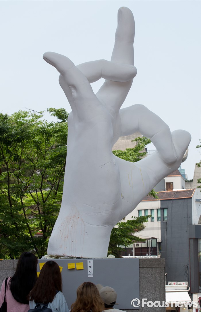 (서울=포커스뉴스) 31일 오후 서울 마포구 홍익대학교 정문에 극우성향 사이트 '일베' 상징물 조각상이 설치돼 있다. 조각상은 일간베스트저장소를 상징하는 자음 'ㅇ'과 'ㅂ' 모양을 하며 회원을 인증하는 손 모양이다. '어디에나 있고, 아무데도 없다'는 제목의 이 조각상은 조소과 4학년 홍기하씨가 '환경조각연구' 수업 과제로 제작해 야외조각전에 출품한 것이다.