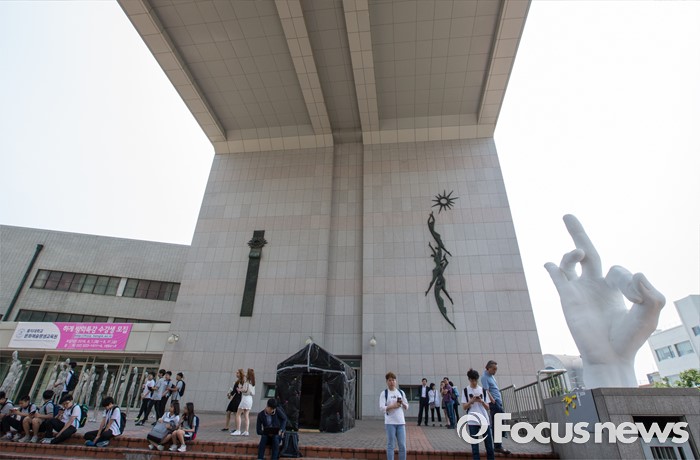 (서울=포커스뉴스) 31일 오후 서울 마포구 홍익대학교 정문에 극우성향 사이트 '일베' 상징물 조각상이 설치돼 있다. 조각상은 일간베스트저장소를 상징하는 자음 'ㅇ'과 'ㅂ' 모양을 하며 회원을 인증하는 손 모양이다. '어디에나 있고, 아무데도 없다'는 제목의 이 조각상은 조소과 4학년 홍기하씨가 '환경조각연구' 수업 과제로 제작해 야외조각전에 출품한 것이다.